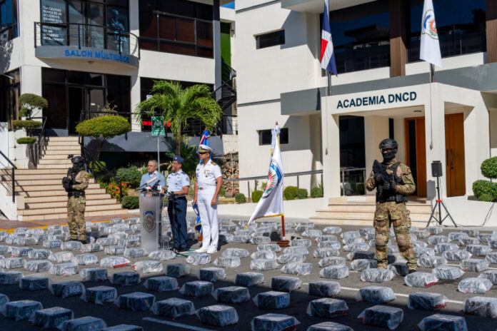 Según informaron las autoridades, el cargamento estaba distribuido en 2,049 paquetes organizados en 69 pacas, ocupados dentro de una lancha rápida tipo “Go Fast” de aproximadamente 30 pies de eslora, equipada con dos motores fuera de borda de 150 caballos de fuerza. La embarcación, sin nombre ni matrícula visible, habría salido desde Sudamérica y fue interceptada tras más de 15 horas de seguimiento ininterrumpido a varias millas náuticas al sur de Baní.